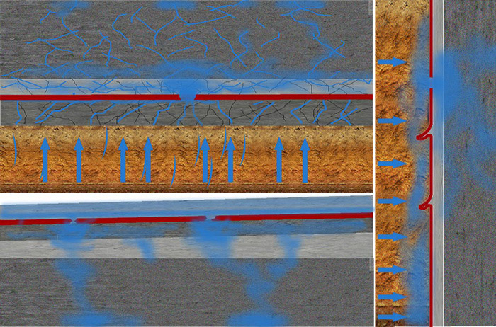 底板及條件允許的側墻合理選材,設計可選用改性瀝青卷材、高分子卷材等防水材料與結構主體達到可靠的反粘結合。